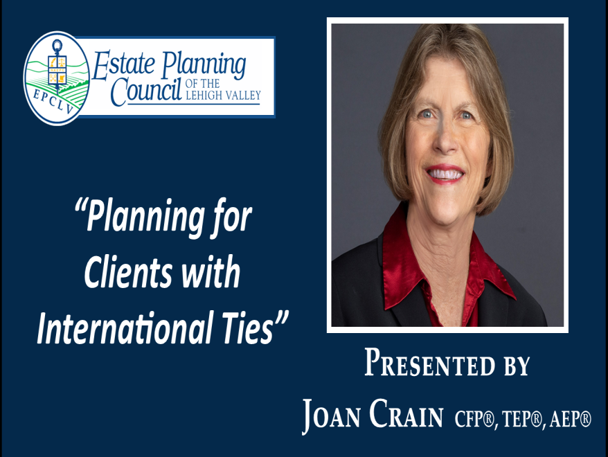 Join us for "Planning for Clients with International Ties" presented by Joan Crain, CFP, TEP, AEP. The event will be held at Aster Event Center on Grange Road in Allentown.